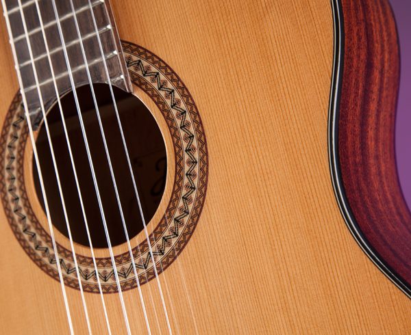 For the music in you, the Jasmine JC-27CE is a full size acoustic/electric classical guitar that offers great sound and premium electronics in a refined and elegant package. For players seeking full, rich tone, the JC-27CE features a select solid cedar top with Jasmine’s Advanced Classical Bracing, and sapele back and sides. The slim neck and full 25 1/2″ scale length provide comfortable feel and excellent playability, and the soft Venetian cutaway gives you unrestricted access to the highest registers of the fingerboard. The onboard Fishman® Isys III preamp system offers a built in digital tuner and three band EQ for clear, natural sound and rock solid amplified performance. Other premium features include a rosewood fingerboard and bridge, a beautiful mosaic rosette, gold tuners with black buttons, and full gloss Natural finish.